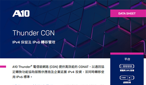 A10 Thunder® 電信級網路 (CGN) 提供高效能的 CGNAT,以通訊協定轉換功能協助服務供應商及企業延展 IPv4 投資,並同時轉移使用 IPv6 標準。