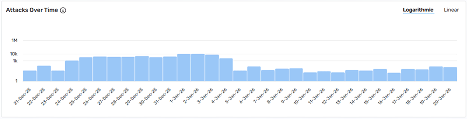 この期間の攻撃頻度を対数グラフで表したのが下図です。1月1日と1月2日に、それぞれ10,000回を超える攻撃を観測しています。
