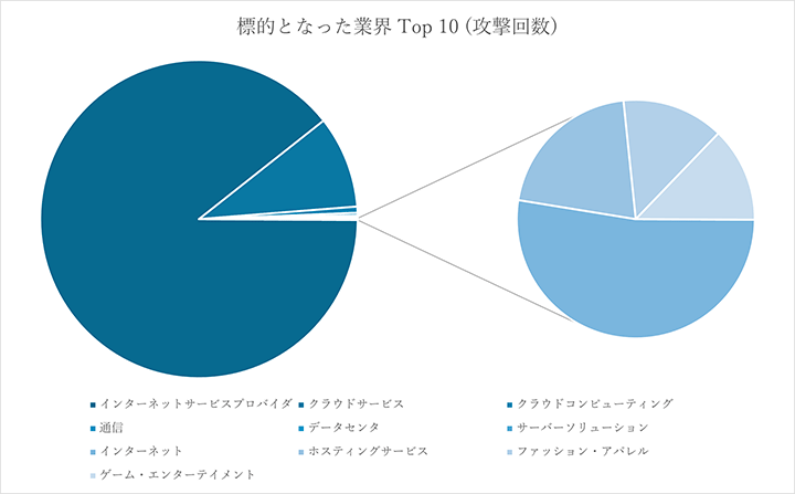 標的を業種で分類し、その攻撃回数を比べてみますと、この期間はインターネットサービスプロバイダへの攻撃が突出していました。