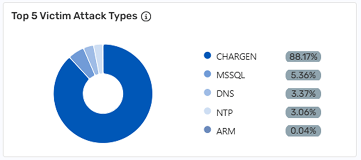 この期間中、日本での標的となった組織への主だった攻撃手法は、先述の世界全体での傾向とは異なる観測となっています。CHARGENプロトコルを用いた攻撃が88.17%を占め、攻撃回数としてはトップでした。CHARGENは古いプロトコルで、テストやデバッグ等を目的としたものですが、接続に対してサーバがランダムな文字列を送信する機能を持つため、DDoSリフレクタ攻撃としても悪用される場合があります。