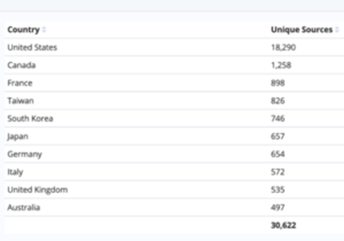 サイバー攻撃の第1ターゲットに対して特定されたARDプロトコルを相互参照すると、A10が追跡しているDDoS武器は30,622個ありますが、そのうち18,290個(59%)が米国に拠点を置いていることが分かります。このようなDDoS武器は他にも数多く存在しており、戦争国以外の国のIT部門がサイバー紛争に巻き込まれる可能性があることを明確に示しています。対策を講じることで、他国の組織もウクライナの被害を最小限に抑えることに貢献することができるのです。今回分析するハニーポットは、米国を拠点としていました。