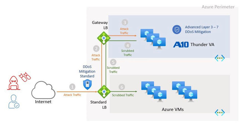 Microsoft Azureでは、Azureマーケットプレイス上でネットワーク仮想アプライアンス(NVA)によるインライン型のDDoS防御追加オプションを提供し、この需要に対応しています。これはAzureのGateway Load Balancer機能を使用することで可能になり、インターネットトラフィックがAzure上にホスティングされるアプリケーションやサービスに流入する際、Gateway Load Balancerがその流入経路に関連するNVAを組み入れます。