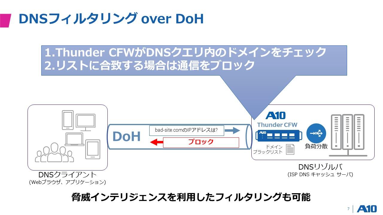 A10が開発しているThunderシリーズは、国内・海外で数多くのサービス事業者様にご利用いただいています。その中で、実際にお客様からご要望もいただき、A10のThunderシリーズでDoHをサポートすることにしました。